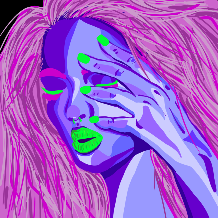 In contrast, the purple illustration is a detail-rich piece with a bolder approach. It uses highly saturated complementary colors: purple for the skin, pink for the hair and body hair, and green for the lips, outlines, and nails. Various tones of these colors were applied to highlight, shadow, and create depth in the composition. An additional challenge for this piece was avoiding any blending, relying solely on defined strokes to achieve the desired effects.