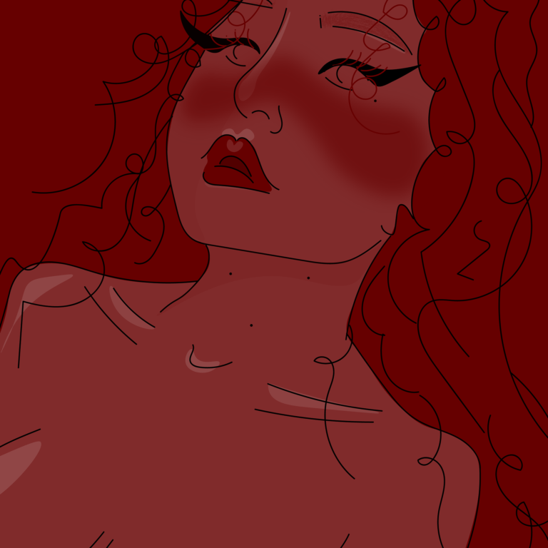The red illustration was designed with the aim of achieving a visually appealing piece using minimal elements. Simple lines and a limited color palette for highlights and shadows add a minimalist touch that contrasts with the intense red of the hair, cheeks, and lips.